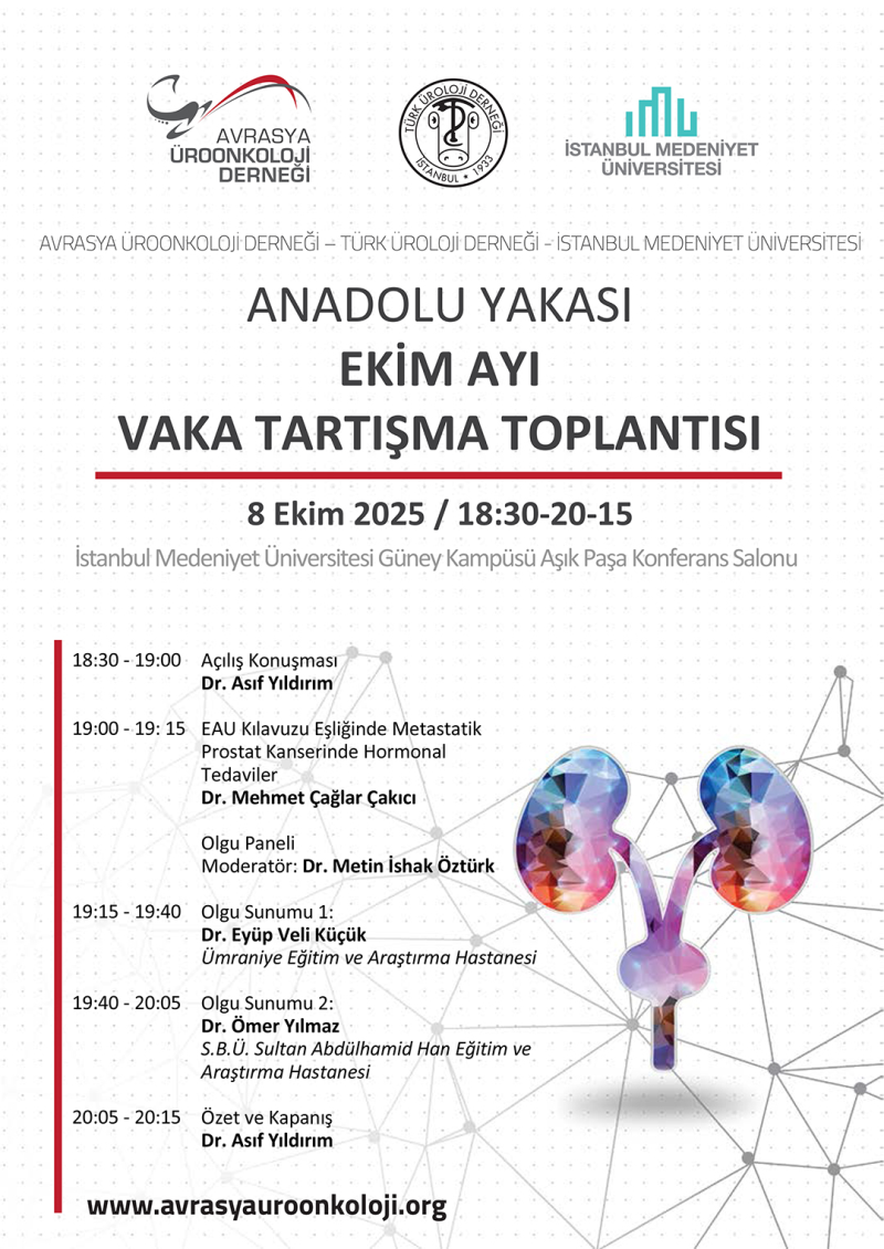Avrasya Üro-Onkoloji Derneği, Türk Üroloji Derneği ve İstanbul Medeniyet Üniversitesi tarafından düzenlenen ANADOLU YAKASI EKİM AYI VAKA TARTIŞMA TOPLANTISI, 8 Ekim 2025 tarihinde 18.30-20.15 saatleri arasında İstanbul Medeniyet Üniversitesi Güney Yerleşkesi Aşık Paşa Konferans Salonu'nda başarıyla gerçekleştirilmiştir.
